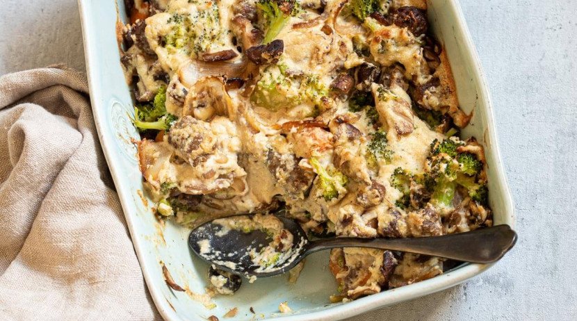Verdeel de saus over de groentes in de ovenschaal en schep het een beetje erdoor. Hoeft er niet helemaal egaal over verdeeld te worden.